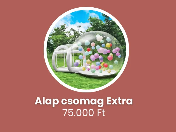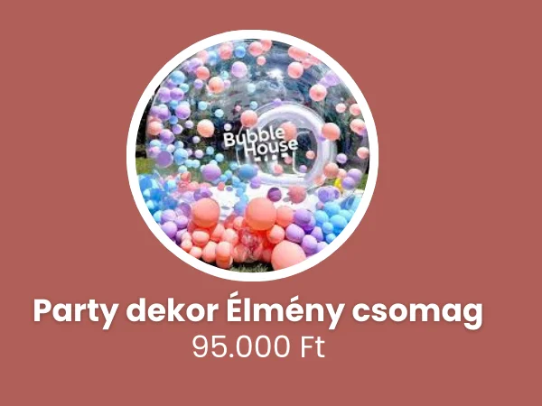 Ezt a csomagot válaszd, ha valódi élményelemet is szeretnél az eseményre. A csomag tartalmazza az összes klasszikus party dekorációs elemet, valamint egy buborékházat, amely önmagában is látványos és különleges élményt nyújt a vendégek számára.