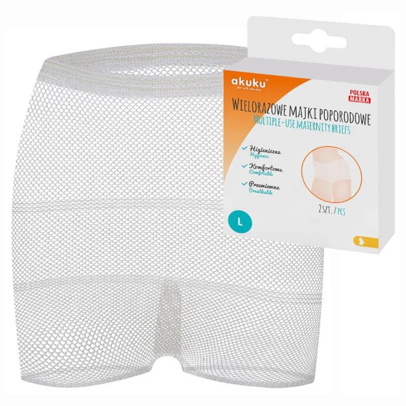 Lélegző, hálós anyagú, többször használható szülés utáni bugyi M-es méretben. Puha gumírozással a kényelemért, higiénikus kialakítással. A csomag 2 darabot tartalmaz.