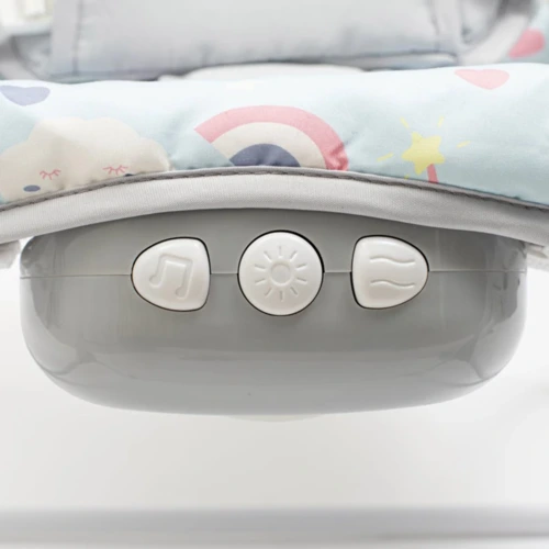 Zenélő, világító, rezgő hintáztatható pihenőszék. Levehető kar, 3 játékkal felszerelve. A pihenőszék két féle pozícióba és rögzítet helyzetbe állítható, amely mind etetőszék használható. A borítás összetétele: 100% pamut. Teherbírás: 9 kg (hinta), 18 kg (ülőke). 3 1,5V AAA elemekre mûködik. A csomagolás nem tartalmazza az elemeket.