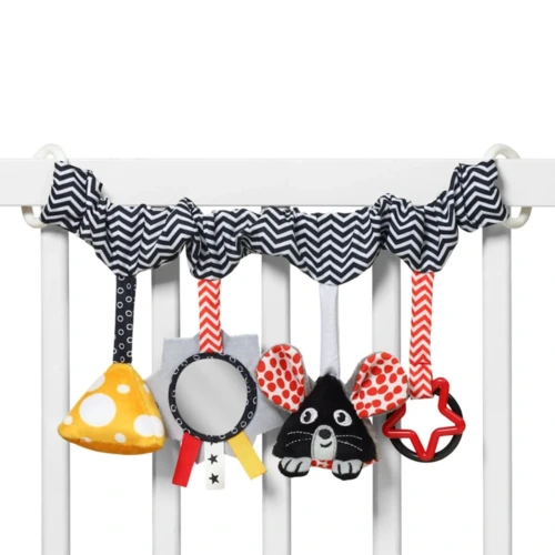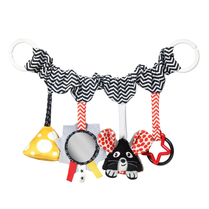 A kontrasztos Cheese and Skip egy szenzoros játék, amely serkenti a tapintást és a látást, valamint fejleszti a gyermek motoros készségeit. Rögzítse babakocsihoz, kiságyhoz vagy autósüléshez, hogy szórakoztassa babáját séta vagy utazás közben. A finom anyaggal borított részen négy darab van felakasztva: egy zörgő sárga sajtdarab, egy biztonságos tükör színes cédulákkal, egy susogó fülû egér, valamint egy kör- és csillagkontúr. Az elemek érdekes választéka felfedezésre ösztönöz, és változatos dizájnjukkal és nagy kontrasztú színeivel felkelti a gyermek figyelmét. A baba egyszerre fog játszani, felfedezni a világot és tökéletesíteni szem-fül koordinációját.