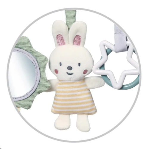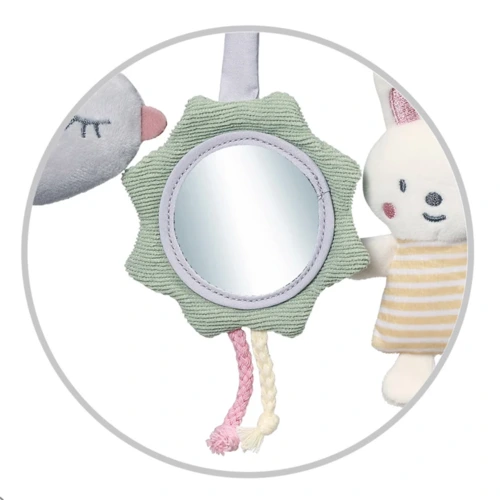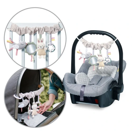 Rögzítse babakocsihoz, kiságyhoz vagy autósüléshez, hogy a baba elfoglalt legyen séta vagy utazás közben. A játékhoz egy susogó nyuszi, egy csillag és egy zörgő madár tartozik, ami nagyon kellemes tapintású anyaggal van bevonva. A gyereknek kínált egyéb tárgyak közé tartozik a tükör. Az érdekes elemek választéka, amelyek kellemes tapintásúak, és változatos kialakításukkal és színükkel felkeltik a baba figyelmét. Lehetővé teszik babájának, hogy felfedezze a világot, és játékon keresztül fejlessze manuális készségeit.