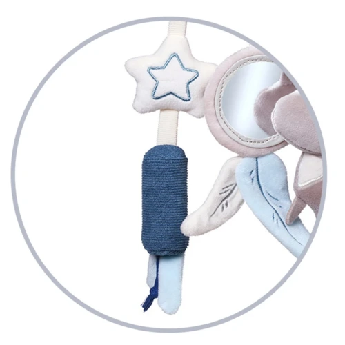 Rögzítse babakocsihoz, kiságyhoz vagy autósüléshez, hogy a baba elfoglalt legyen séta vagy utazás közben. A játékhoz egy susogó farkú csengettyûs mosómedve, egy csillag karikával rágóka és egy csillag tartozik, ami nagyon kellemes tapintású anyaggal van bevonva. A gyereknek kínált egyéb tárgyak közé tartozik a tükör. Az érdekes elemek választéka, amelyek kellemes tapintásúak, és változatos kialakításukkal és színükkel felkeltik a baba figyelmét. Lehetővé teszik babájának, hogy felfedezze a világot, és játékon keresztül fejlessze manuális készségeit.