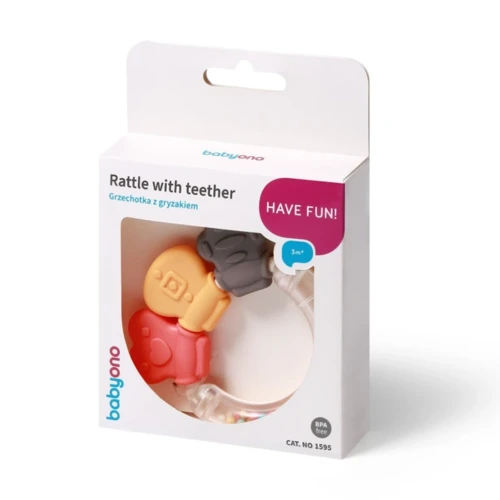 A BabyOno csörgőt és rágókát ötvöző játéka tökéletes első játék babája számára. Teljesen biztonságos és kellemes tapintású anyagokból készült. A csörgő praktikus felépítésének köszönhetően a baba könnyen tudja tartani kis kezében. A csörgő ideálisnak bizonyul a koordináció és a kézi készségek vicces és biztonságos fejlesztésére.