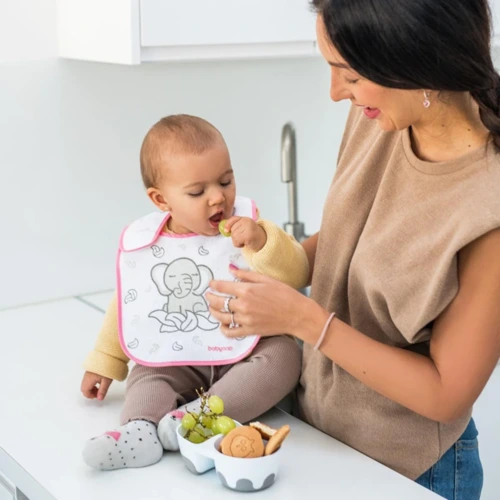 Kiváló minőségû, 100% pamut frottír anyag. A vízálló réteg védi a ruhát a szennyeződéstől és a nedvességtől. Kényelmes és praktikus tépőzáras rögzítés.