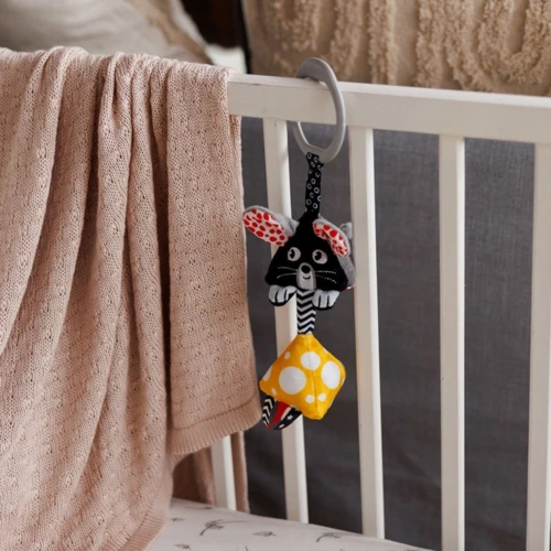 Függő játékunk csörgőkkel rendelkezik, amelyek kellemes hangokat adnak ki – hangosabbakat a sajtban és halkabbakat az egérben. Mozgásra ösztönzik, serkentik a hallást és szórakoztatják. A kicsi élvezni fogja a fogást, a rázogatást és a hallgatást.