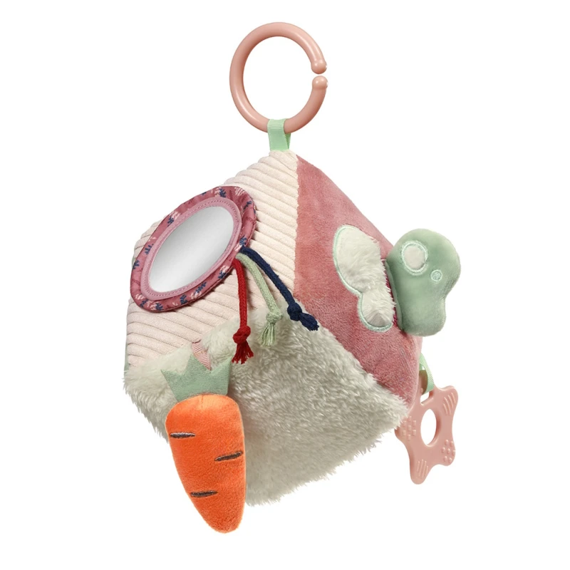 A gyerekeknek szóló aktivitáskocka egy susogó játékot és egy finom csörgőt is rejt, amelyek serkentik a hallást. A kiálló szalagok és zsinórok a fogásra ösztönzik, a biztonságos tükör pedig arra ösztönzi őket, hogy felfedezzék saját tükörképüket. A puha rágóka kellemesen masszírozza az ínyt.
