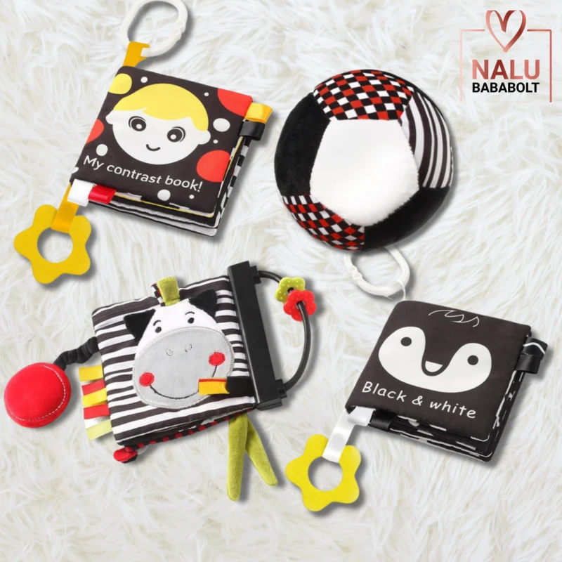 A BabyOno Kontrasztos Könyvcsomag + Labda négy érzékelésfejlesztő babajátékot tartalmaz: három puha kontrasztos játékkönyvet és egy puha fejlesztő labdát. Tökéletes a vizuális, tapintási és kognitív fejlődés támogatására már újszülött kortól.