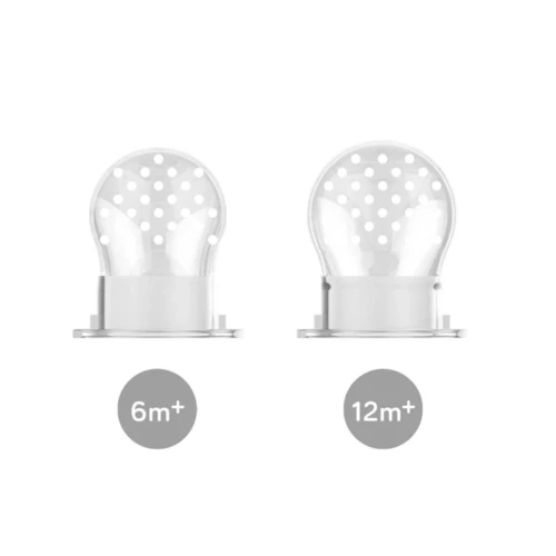 A készlet két (egy 6 és egy 12 hónapos kortól használható) lyukacsos etetőcumit tartalmaz, hogy a terméket a gyermek életkorához és képességeihez igazíthasd.