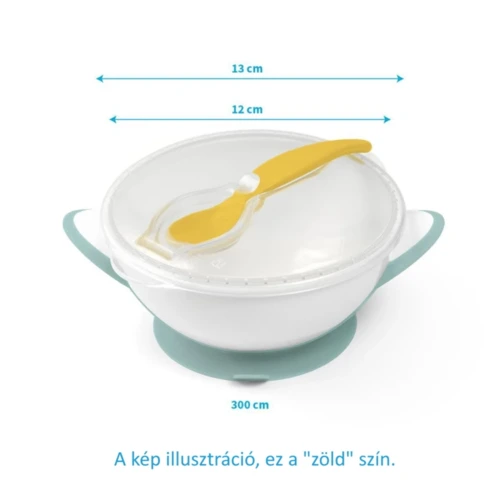 A tál speciális fedéllel rendelkezik, amely nemcsak az ételt védi, hanem egy praktikus helyet is biztosít a kanál tárolására, így az mindig kéznél van, és nem szennyeződik be. A tál tapadókoronggal van ellátva, amely stabilan rögzíti a tányért sima felületeken, minimalizálva az étel kiömlésének kockázatát.