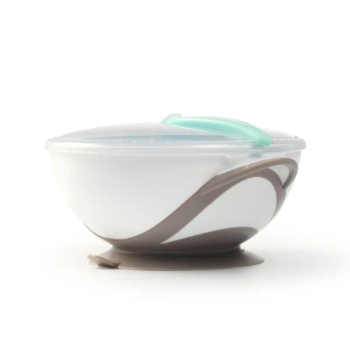 A tál speciális fedéllel rendelkezik, amely nemcsak az ételt védi, hanem egy praktikus helyet is biztosít a kanál tárolására, így az mindig kéznél van, és nem szennyeződik be. A tál tapadókoronggal van ellátva, amely stabilan rögzíti a tányért sima felületeken, minimalizálva az étel kiömlésének kockázatát.
