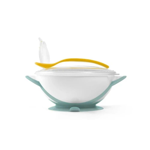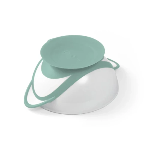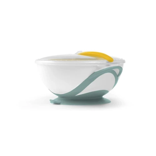 A tál speciális fedéllel rendelkezik, amely nemcsak az ételt védi, hanem egy praktikus helyet is biztosít a kanál tárolására, így az mindig kéznél van, és nem szennyeződik be. A tál tapadókoronggal van ellátva, amely stabilan rögzíti a tányért sima felületeken, minimalizálva az étel kiömlésének kockázatát.
