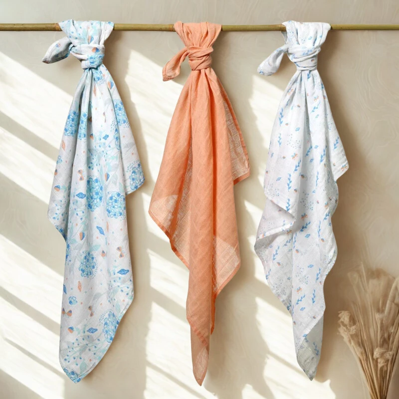 Puha, 100% pamut muszlin textil pelenka szett újszülötteknek — a BabyOno 3-darabos készlet (barack színben) sokoldalúan használható: pelenkázáshoz, büfiztetéshez, törölközőként, vagy babakocsira terítve. Könnyen mosható, újra- és sokszor használható, így praktikus és környezetbarát választás a mindennapokra.