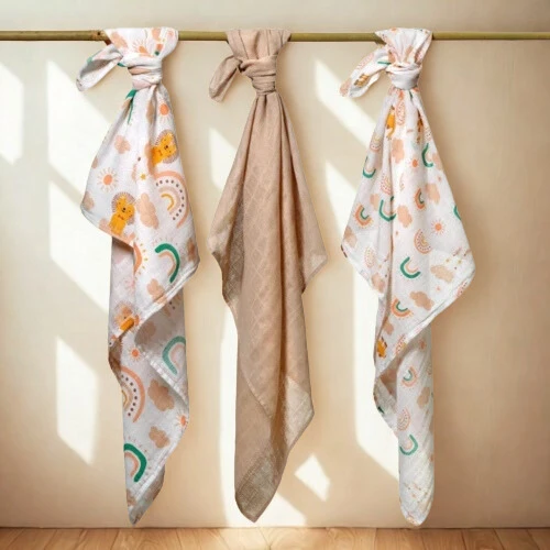 Puha, 100% pamut muszlin textil pelenka szett újszülötteknek — a BabyOno 3-darabos készlet (bézs színben) sokoldalúan használható: pelenkázáshoz, büfiztetéshez, törölközőként, vagy babakocsira terítve. Könnyen mosható, újra- és sokszor használható, így praktikus és környezetbarát választás a mindennapokra.