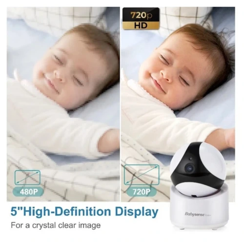 A V65 Baby Video Monitor nagy felbontású 5 colos LCD kijelzővel és egy 720P HD kamerával van ellátva, távoli Pan, Tilt & Zoom funkcióval.