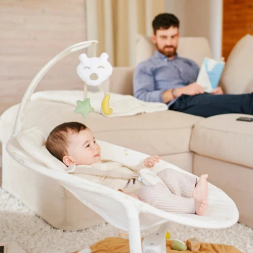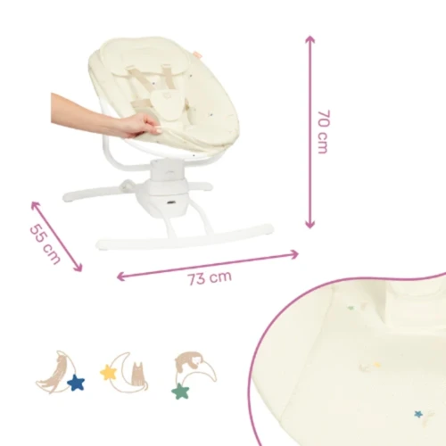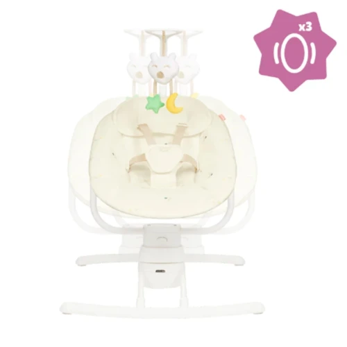 Akár megnyugtatja, ringatja vagy játszik babájával, a hinta 3 oldalirányú lengési sebességet kínál. Több pozícióba állítható játékív, amely elősegíti a baba felébresztését. 5 pontos biztonsági övvel felszerelt, a baba így teljes biztonságban tud játszani.