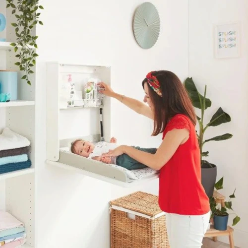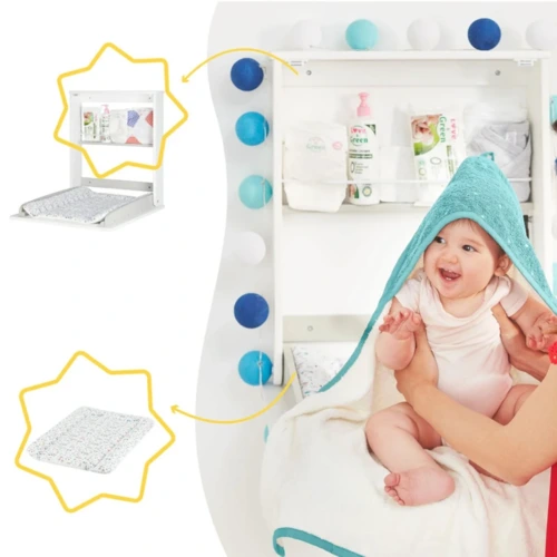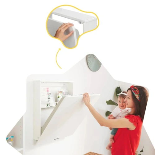 A szekrény egyszerűen a falra szerelhető, és használaton kívül kompakt méretűre csukható, így nem foglal felesleges helyet. Kinyitva kényelmes és biztonságos pelenkázófelületet biztosít, a belső polcain pedig praktikusan elrendezhetők a legszükségesebb babaápolási kellékek – krémek, törlőkendők, pelenkák, testápolók.