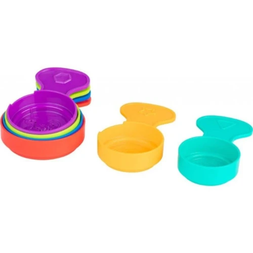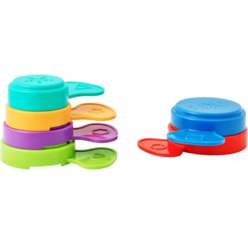 A tálcáknak egy praktikus fogantyújuk van, így könnyedén felveszik a kis kezek. Minden tálca különböző színû és méretû, és minden tálcának más a szita mintája.