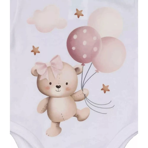 Kisbabák ruhatárának praktikus alapdarabja a body. Ez a cuki macis mintával nyomott baba body minőségi, bababarát 100% pamut anyagból készült, szín- és formatartó anyagból, ami jól bírja a gyakori mosást is. Vállán patentos, így megkönnyíti a baba öltöztetését. A lába közötti patentos megoldás, pedig a gyors peluscserét teszi lehetővé.