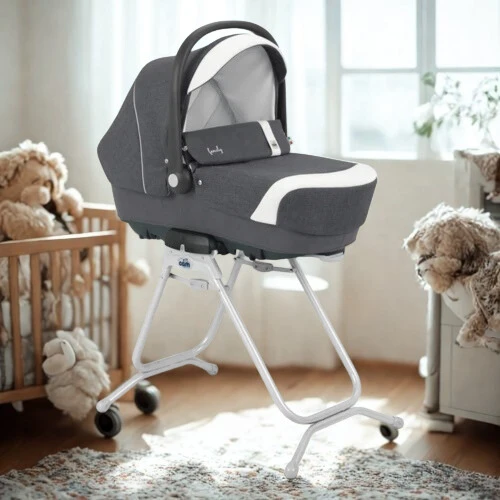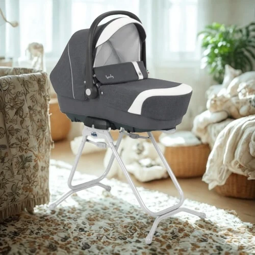 Könnyed mozdulattal rögzíthető az állványra a babakocsi spotrésze, a mózeskosár vagy az autósülés. Ideális otthoni használatra, kertbe, teraszra, nagyszülőkhöz. Kompakt méretûre csukható.