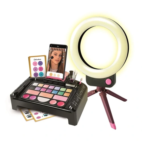 - Munkaállomás alap a termékek tárolásához - szivacs, ecsetek, applikátorok, kártyák és mobiltartó - sminkpaletta 14 db szemhéjfestékkel - 2 db arcpír, 1 db púder, 4 db szájfény - LED gyűrűs szelfilámpa állvánnyal - sminkkártyák tipekkel és technikákkal - matrica, útmutató - Make Up alkalmazás okostelefonra