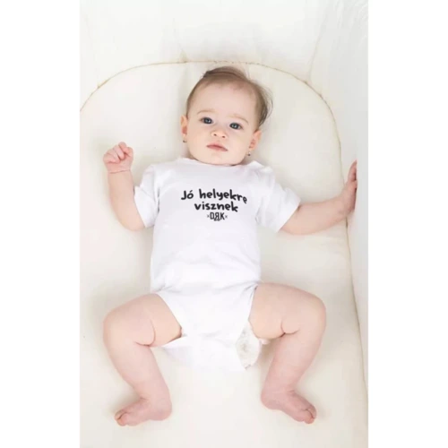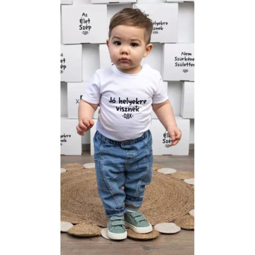 Egy igazán vagány "Jó helyekre visznek" felirattal hívja fel magára a figyelmet ez a baba body. A kisbabák komfortját szem előtt tartva készült, ennek megfelelően 100% pamutból szabták, ami puha, szín- és formatartó, emellett tökéletesen bírja a gyakori mosást is. Patentos kialakításának köszönhetően a vállánál könnyedén felvehető, míg a lába közötti patentok a gyors peluscserét teszik gyerekjátékká.