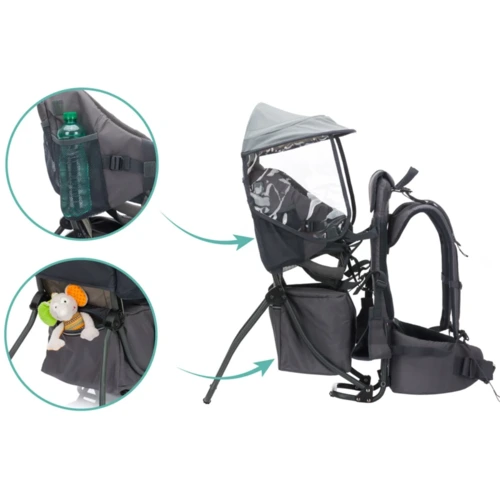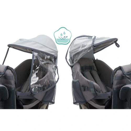 Az ülés puha és kényelmes párnázással van ellátva, míg az összes heveder többfunkciósan állítható. Az Elite hátsó hordozó lábpántokkal is rendelkezik, amelyek optimális könnyítést biztosítanak gyermeke lábának túrázás közben. Ez még nagyobb kényelmet és biztonságot biztosít. A nap- és esőernyő könnyen rögzíthető, és optimális védelmet nyújt minden időjárási körülmény ellen.