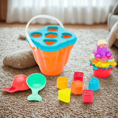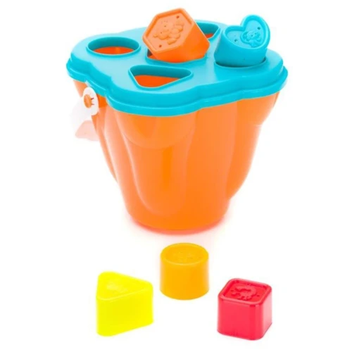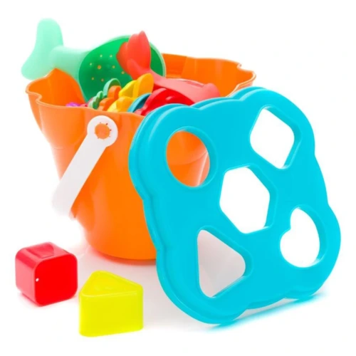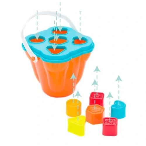 Játékvödör tetővel és fogókával, 2 szitát, 6 formát és 8 egymásra rakható csészét tartalmaz. A formák mind tárolhatók a dobozban.