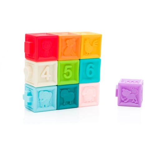 Összeépíthető különböző színû puha kockák rajtuk különböző felületekkel, számokkal, állatokkal.