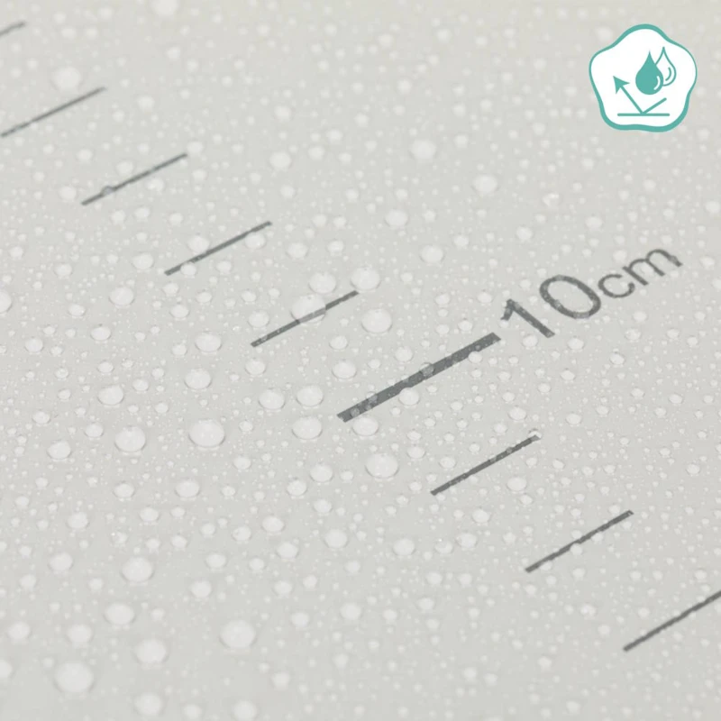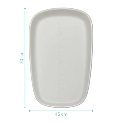 A nagyméretû, 72 × 45 cm-es méretnek köszönhetően a babának rengeteg helye van a mozgásra, míg a megemelt szélek nagyobb biztonságot nyújtanak. A felület könnyen tisztítható, így ideális mindennapi használatra – akár a fürdőszobában, a gyerekszobában vagy a komódon. További részlet a fekvőfelületen található nyomtatott skála – így könnyedén figyelemmel kísérheti, ahogy a kicsi napról napra növekszik. Az időtlen, semleges szürke dizájn tökéletessé teszi bármilyen otthonba.