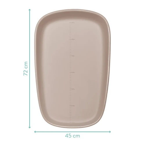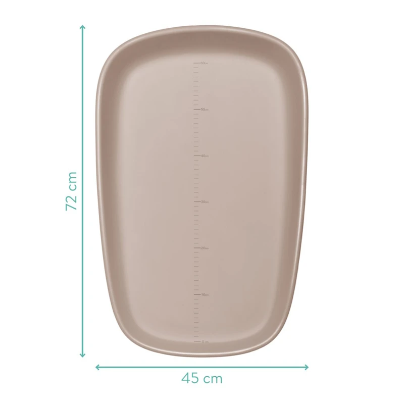 A nagyméretû, 72 × 45 cm-es méretnek köszönhetően a babának rengeteg helye van a mozgásra, míg a megemelt szélek nagyobb biztonságot nyújtanak. A felület könnyen tisztítható, így ideális mindennapi használatra – akár a fürdőszobában, a gyerekszobában vagy a komódon. További részlet a fekvőfelületen található nyomtatott skála – így könnyedén figyelemmel kísérheti, ahogy a kicsi napról napra növekszik. Az időtlen, semleges szürke dizájn tökéletessé teszi bármilyen otthonba.