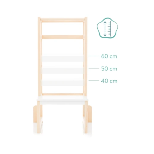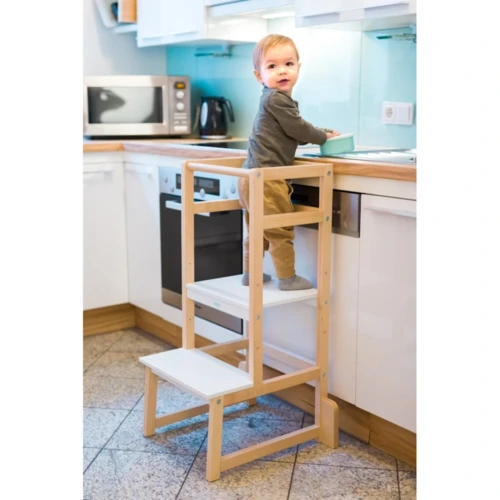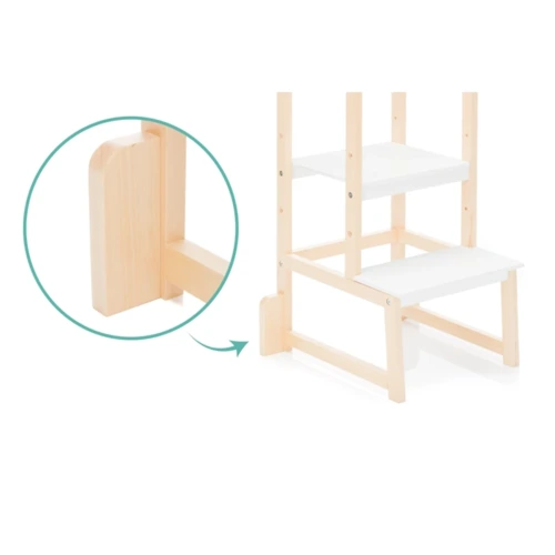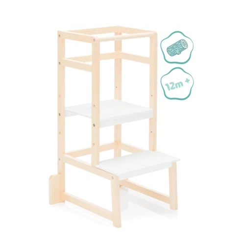 Nem csak ránézésre szép és modern, de egyszerû kialakításával minden lakókörnyezetbe tökéletesen illeszkedik és rendkívül stabil, és oldalsó támaszaival valamint masszív felépítésével kiváló védelmet nyújt a felborulás ellen. Mivel kicsikéink olyan gyorsan nőnek, így az alaplap magassága is tökéletesen állítható a gyermek pillanatnyi magasságához. Amint elsajátították a felfelé vezető utat, a kerek rúd a tartásra és természetesen a kiesés elleni védelemre szolgál. Így gyermekünk bárhol segíthet, legyen szó főzésről, sütésről vagy akár fogmosásról, ez a torony ideális segítő, amikor a lábak rövidnek tûnnek. A szülőkkel vagy idősebb testvérekkel szemmagasságban való játék és tanulás segít a gyermeknek abban, hogy nagyon gyorsan megtapasztalja a szociális interakciókat, fejleszti készségeit, és segít megerősíteni az egymás közötti kötődést.