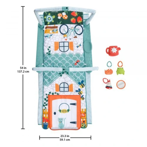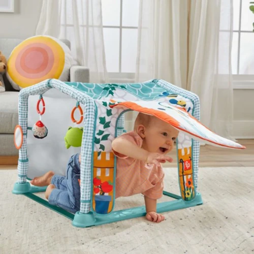 A Fisher-Price átalakítható édes otthon játszószőnyeg 3 játéklehetőséget kínál a gyerek fejlettségi szintjének megfelelően. Az újszülöttek kényelmesen hanyatt fektetve a fej felett lógó játékokat nézhetik és próbálhatják megfogni. Amikor a kicsik már ki tudják tolni magukat a hasonfekvő játékokhoz, egy extra panel segítségével a szőnyeg szórakoztató játéktérré alakítható. Ha pedig a kicsi már közlekedik, akkor jön el a legnagyobb móka, mert egy alagúttá alakítható, ahol átbújós és kukucska játékot is játszhatnak vagy a világító és zenélő öntözőkannával meglocsolhatják a képzeletbeli virágokat.