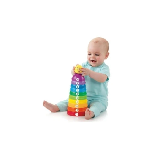 A baba rengeteget tanul a játékon keresztül, és ezek az egymásba rakható, összerakható, összeillő és forgatható csészék számtalan lehetőséget adnak a felfedezésre. 10 színes csészét, amelyet meg lehet fogni, egymásba lehet rakni, össze lehet rakni és barázdált felületet tartalmaz, hogy finoman illeszkedjen és könnyen mozgatható legyen. A különböző színek, méretek és számok is fejlesztik a korai felismerő képességet. Nevető, csilingelő labda lapul mindegyik csésze belsejében, vagy tehető az egész építmény tetejére!