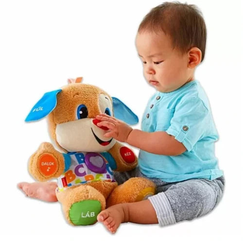 Fedezzétek fel együtt a világot a Fisher-Price Tanuló kutyussal! A Fisher-Price Tanuló kutyus világoskék fülû, piros orrú barátságos plüsskutya, aki azonnal a babák kedvence lesz! A kutya testrészeit megnyomva a játék megtanítja azok neveit, a színeket, az ABC-t és a formákat is. A kutyus igazodik a baba tudásszintjéhez, többféle szinten tud kommunikálni a babával. A Fisher-Price Tanuló kutyus 75 különféle hanggal, dallammal és kifejezéssel szórakoztatja a picit, a játék ölelgethető, puha töltéssel készült. A Fisher-Price Tanuló kutyus 3 db AA ceruzaelemmel mûködik, a csomagolás az elemeket tartalmazza. Méret: 27 cm.