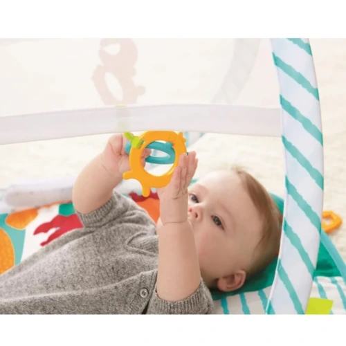Ezzel a játszószőnyeggel gyermekednek önfeledt szórakozásban lehet része. A tengeri motívumokkal díszített, két könnyû boltívvel ellátott teljes értékû játszószőnyeget egyszerûen összehajthatod, és a pelenkázó táskába, vagy a babakocsi zsebébe rakhatod. A tengeri állatokat ábrázoló négy csodás játék minden kis felfedező figyelmét felkeltik, megpróbálják majd elérni, megfogni és megrágni őket.