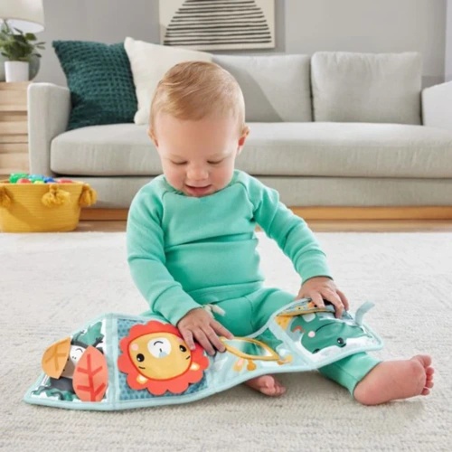 A Fisher-Price puha, kihajtogatható babafoglalkoztató könyvecskéjével a kisbabák játékosan tanulhatnak és fejlődhetnek. A könyvecske kétoldalú, így 4-4 lapján a legkisebbek különböző felületekkel ismerkedhetnek meg. Az éles kontrasztok, a színek, a puha és érdekes anyagok, az imádnivaló állatfigurák és a tükör mind játszva fejleszthetik a kicsiket. A könyvet a földre helyezve, harmonikaszerûen vagy kockává hajtogatva hason fekvő és ülő játékhoz is remek választás.