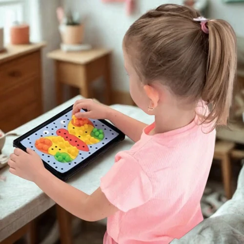 Beillesztős fejlesztőjáték három éves kortól. Játszva fejleszi a szem-kéz koordinációt, az ujjak mozgását és a színek felismerését, a képek kirakását segítő lyukacsos táblával. A játék apró, a táblába könnyen behelyezheto bábukat tartalmaz különböző színekben. Ezek segítségével számos érdekes figura rakható ki.