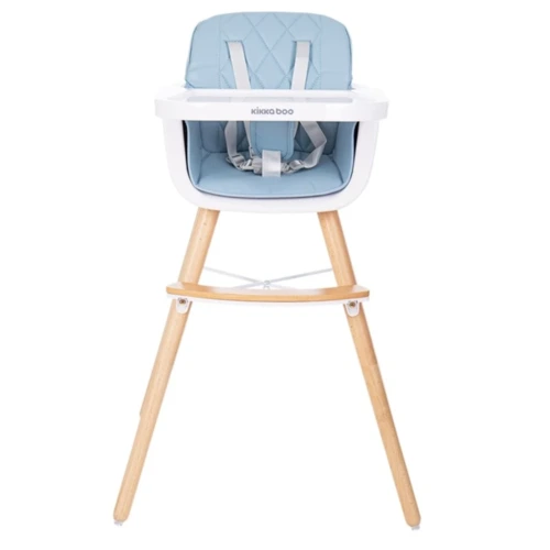 Modern, csúszásgátlós falábú Kikkaboo Woody kék etetőszék, 5 pontos biztonsági övvel, állítható tálcával és ökobőr üléshuzattal. Akár 36 kg-ig használható, kisszékké alakítható.