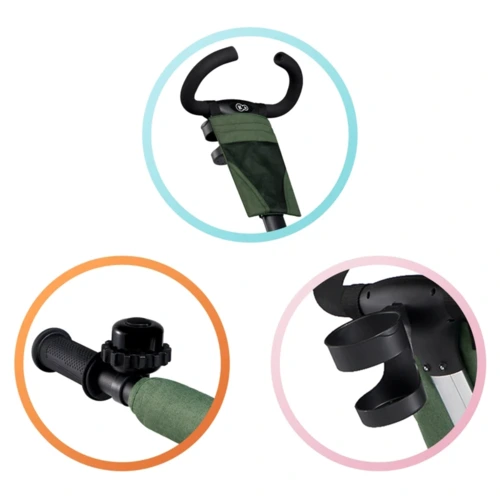 ● A plusz kiegészítők még kellemesebbé teszik a sétát. Két kosár (egy nagy hátul, és egy kicsi elöl), amelyekbe mindenféle kiegészítő belefér. A te cuccaidnak a tolókaron elhelyezett kistáska biztosít helyet, amely szintén a készlet része.