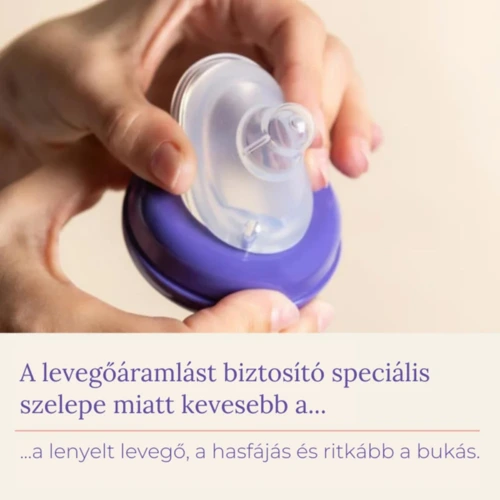 – A levegőáramlást biztosító speciális szelepe miatt kevesebb a lenyelt levegő, a hasfájás és ritkább a bukás.