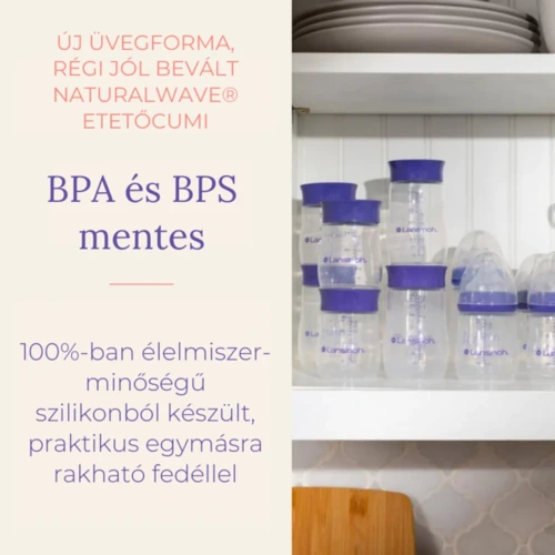 A Lansinoh 240 ml cumisüveg tetővel kifejezetten szoptatott babáknak készült, közepes folyású hullámvonalú etetőcumival. Extra puha szilikon, cseppmentes kialakítás és AVS szelep csökkenti a levegőnyelést, hasfájást és bukást. A stabil, egymásba rakható tető praktikusan tárolhatóvá teszi a cumisüveget.