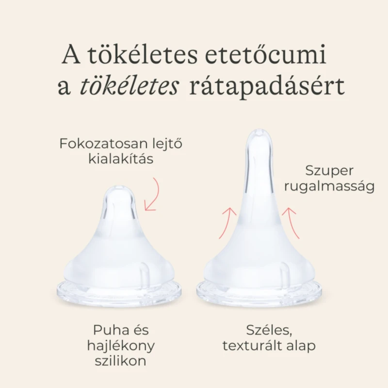 Puha, rugalmas szilikon: támogatja a baba megszokott szopó mozgását és nyelvét természetes hullámvonalú mozgásra ösztönzi.
