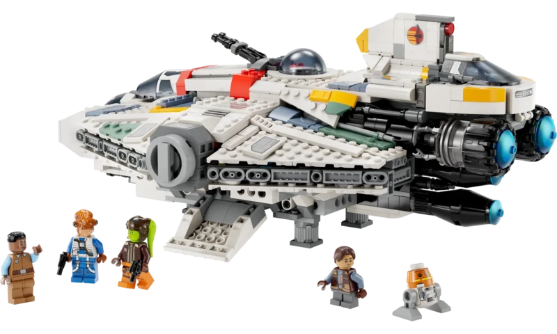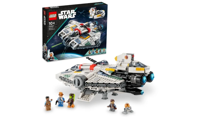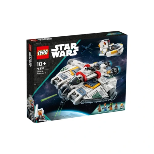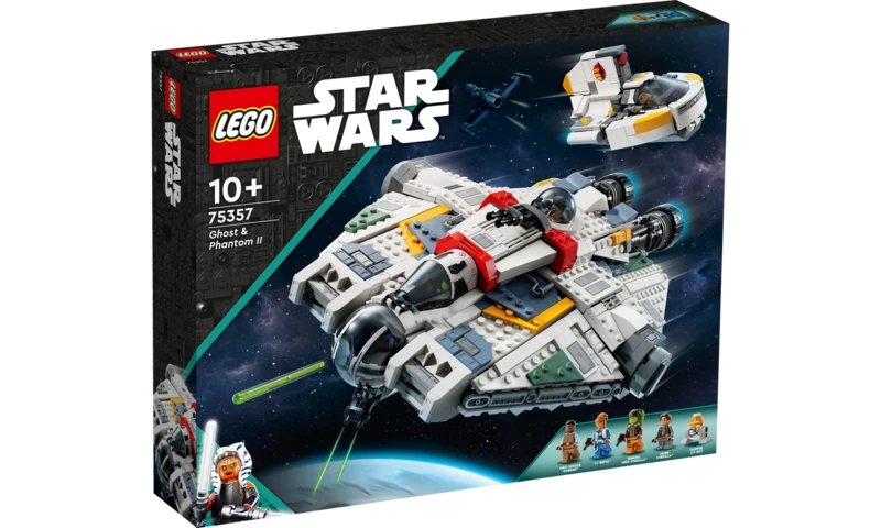 A rajongók eljátszhatják a Star Wars: Ahsoka emlékezetes jeleneteit a Ghost és Phantom II (75357) csillaghajók LEGO® kockákból épült modelljeivel. A megépíthető Ghost modell 2, karral aktiválható rugós kilövővel van felszerelve, van rajta egy kétüléses vezetőfülke a LEGO® minifiguráknak, levehető első résszel. Emellett tartalmaz 2 felnyitható ajtót és egy leválasztható tornyocskát ágyúval (nem tud lőni) és hellyel a LEGO minifigurának. A Phantom II sikló vezetőülése felnyitható a minifigura számára, és van rajta egy tárolóegység. 5 Star Wars™ szereplő is tartozik a szetthez, köztük Hera Syndulla LEGO minifigurája és Chopper (C1-10P) LEGO droid figurája.
