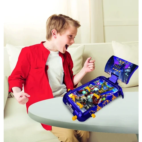 Ha eredeti szórakozást keres gyerekeknek, próbálja ki az elektronikus asztali flippert. A játék célja a labda mozgásban tartása a lehető leghosszabb ideig, és a lehető legmagasabb pontszám elérése. A gyerekeknek meg kell akadályozniuk, hogy a labda a karok (uszonyok) közé essen, és ezzel egyidejűleg a játéktér közepén elhelyezett lökhárítókra kell pattanniuk. Ezek a lökhárítók teszik lehetővé számukra a pontszerzést – minél több ütés, annál több pont. A játékot nagyszerű hang- és fényeffektusok teszik teljessé, mint egy igazi flipper. Két állvány ideális szöget biztosít a flippernek a játékhoz. A pontszám az LCD-kijelzőn látható, és egyszerű kezelőszervekkel be- vagy kikapcsolhatja a hangokat, és új játékot indíthat. A gyerekek egyedül játszhatnak, vagy versenyezhetnek a barátaikkal, hogy megverjék a legmagasabb pontszámot. Szóval hajrá!