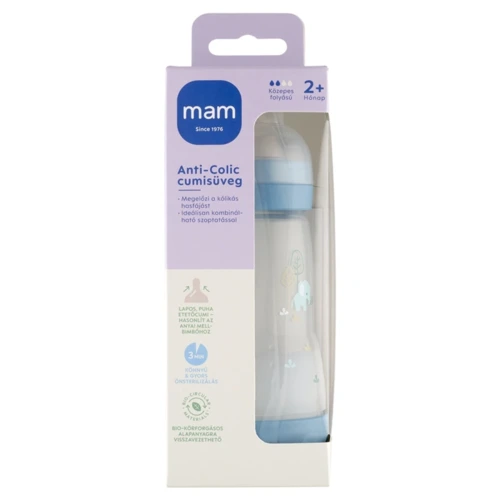 A MAM Anti-colic cumisüveg lecsavarható alja miatt könnyen tisztítható és egyedülálló önsterilizáló funkcióval is rendelkezik. A SkinSoft szilikon etetőcumi minden MAM szélesnyakú cumisüveggel és a Trainer tanuló pohárral kompatibilis. Az alkatrészek nem kompatibilisek más gyártók termékeivel.