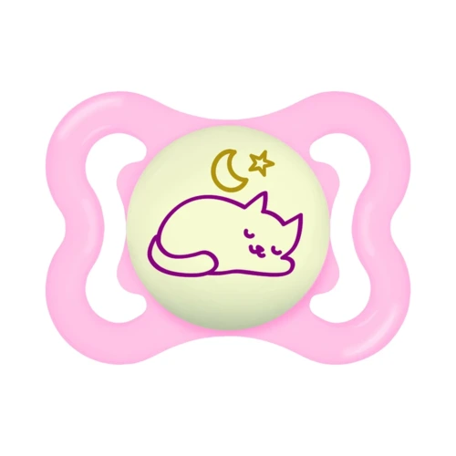 A MAM Supreme Night szilikon játszócumi 0 hó+ dupla, lány SkinSoft szilikon szívókával, sötétben világító gombbal és sterilizáló dobozzal. Bőrbarát, BPA-mentes, újszülötteknek ideális választás.