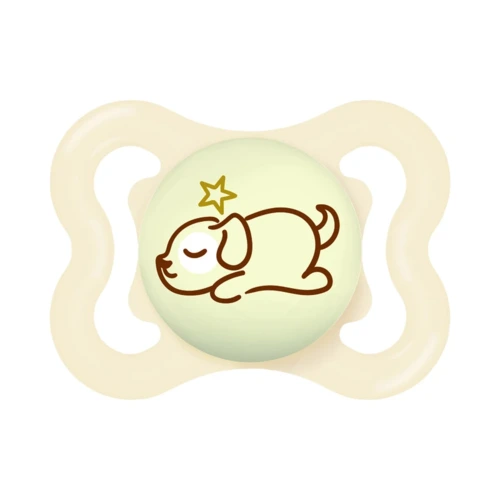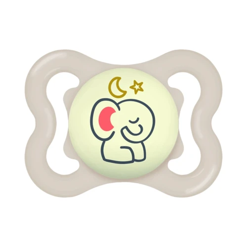 A cumi gombja sötétben világít, így éjszaka is könnyedén megtalálható. A hajlított pajzs és a nagy szellőzőnyílások különösen bőrbarát megoldást kínálnak, megelőzve a kipirosodást és az irritációt. A szimmetrikus kialakítás biztosítja, hogy mindig tökéletesen illeszkedjen a baba szájába. A praktikus gomb gyors fogást tesz lehetővé, és egyszerűen rögzíthető hozzá a cumitartó szalag.