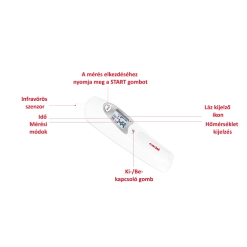 A Medel fülhőmérő csomagában 15 védőkupak található a higiénikusabb és biztonságosabb lázmérés érdekében. Néhány másodperc alatt érzékeli a hőmérsékletet a mérés végén hangjelzéssel. Más hangjelzéssel jelzi a hőemelkedést és a lázat (ha eléri a 38 °C-ot). A 38 °C-os és afeletti testhőt szomorú ikonnal, az alattit mosolygós ikonnal is jelzi.