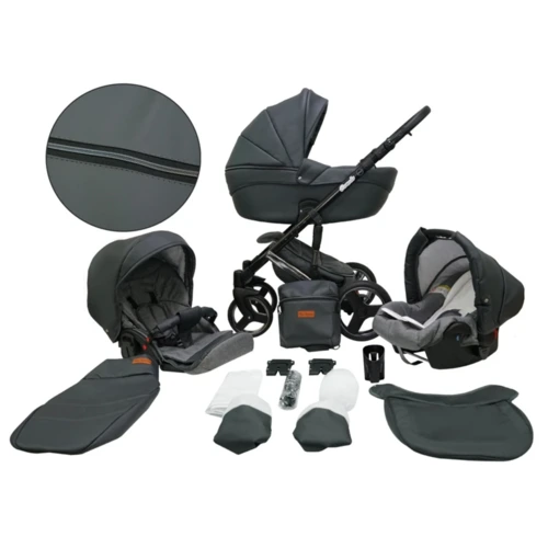 Mikrus multifunkciós babakocsi Comodo Silver (merev mózes, hordozó 0-10kg, pelenkázótáska) mûbőr 02 grafitszürke