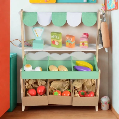 - Természetes Fa Anyagok: A szupermarket kiváló minőségű, tartós faanyagokból készült, biztonságos és hosszú távú játékélményt biztosítva.